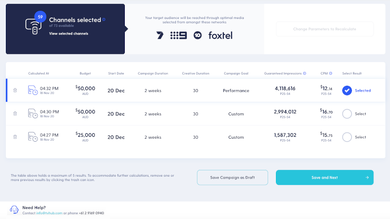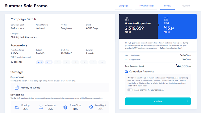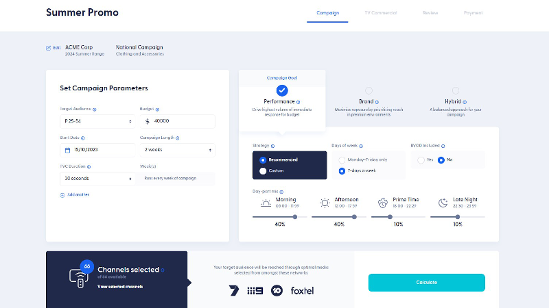 Select your target audience, budget and campaign dates. Then choose a proven pre-set buying strategy, or create your own. You can select linear & BVOD, what times of day, and which networks you want.